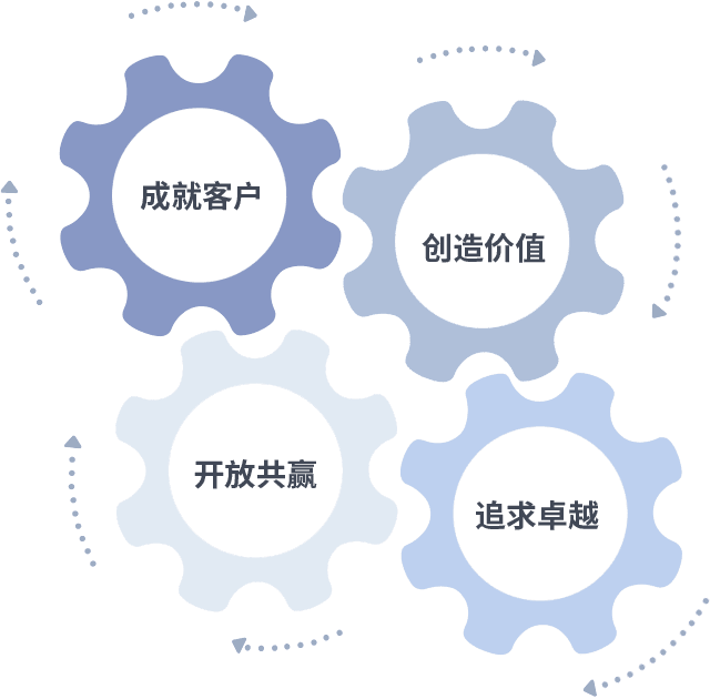 成就客户是一切决策的出发点,,,创造价值是衡量所有工作的标准,,,,追求卓越是我们做事做人的态度,,,开放共赢是我们的格局也是最终的结果。。。价值观的齿轮环环相扣,,,,推动着组织里的每个人不断向前。。